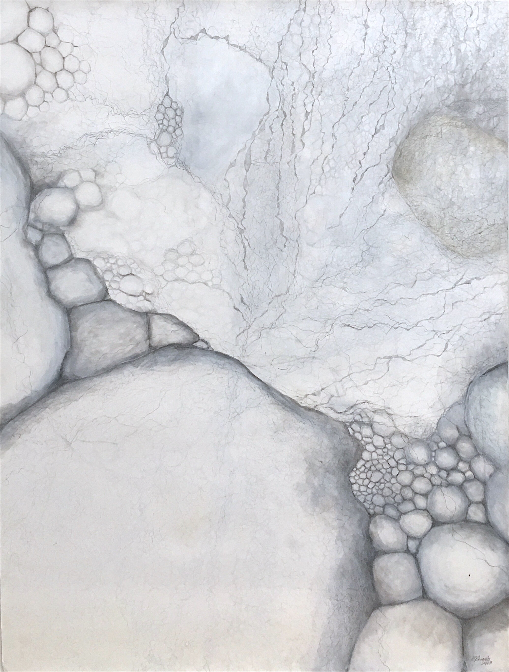 “It took me years to pinpoint this, but ultimately I’ve concluded that the art I make often stems from a deep, empathic desire to respond to situations that I, or others, feel, but don’t necessarily understand; situations that may seem senseless, or tragic, but that connect us to our collective experience of being human. I’m fascinated by psychological spaces of human experience that aren’t easily defined, but that are undoubtedly felt. This is an abstract idea. Instead of taking something specific, and abstracting its essence, my work attempts to take something abstract, like the idea of liminal psychological space, and suggest its specificity through visual language. We become overwhelmed by experiences we don’t understand, but we’re also seduced by our desire to understand them more clearly. I use mark-making and obsessive micro-textures to express that tension. By conjuring and obscuring biomorphic shapes with graphite and water media I attempt to depict these infinite psychological spaces of human experience, giving the illusion of form to something that seems present but simultaneously formless.”